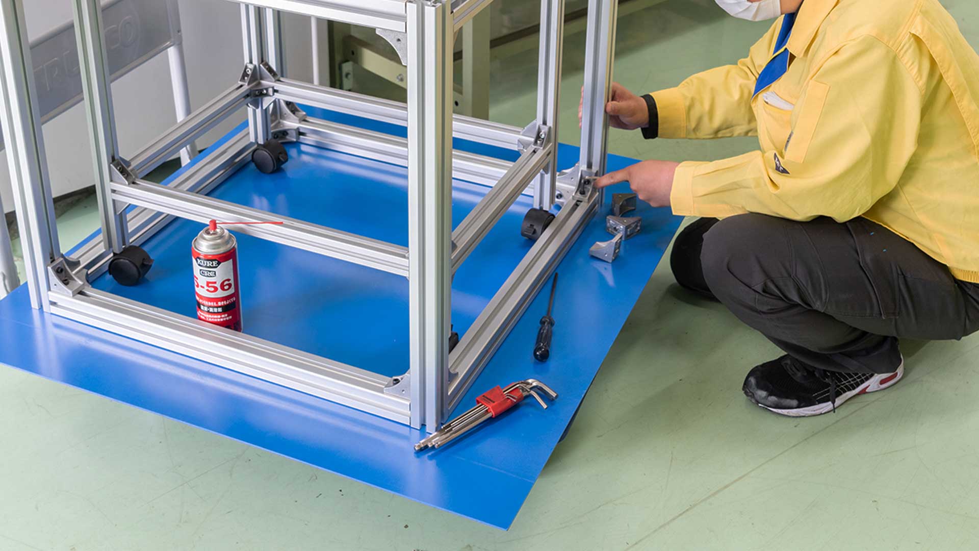 台車、作業台などをSUSアングル、アルミフレームにて設計して、社内で組付をして、検査、梱包、納品まで一貫して対応しております。治具、ASSY品もピン圧入、ボルト類の締結の他、樹脂、ゴムの貼り付け作業も一部行っております。